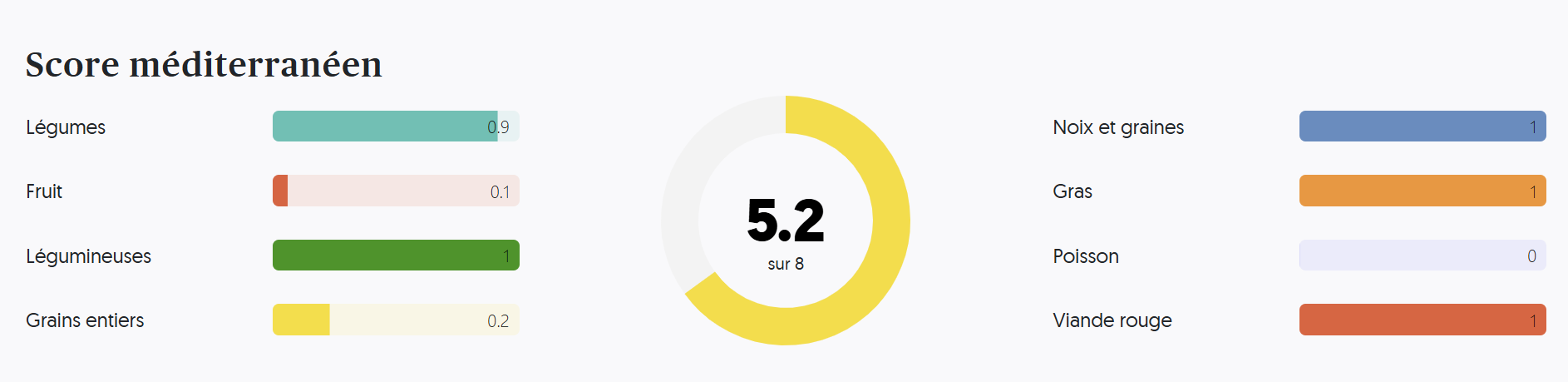 Le système évalue également l’apport en fruits et légumes de façon intégrée, en considérant leur équilibre plutôt que leur consommation isolée. Ainsi, un apport élevé en légumes combiné à un apport moindre en fruits (ou l’inverse) est tout de même valorisé, tant que la diversité végétale est présente.